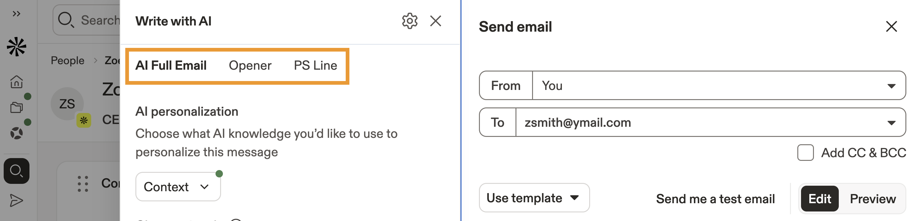 You can use the AI writing assistant to write an email to a single prospect or to write emails in a sequence: