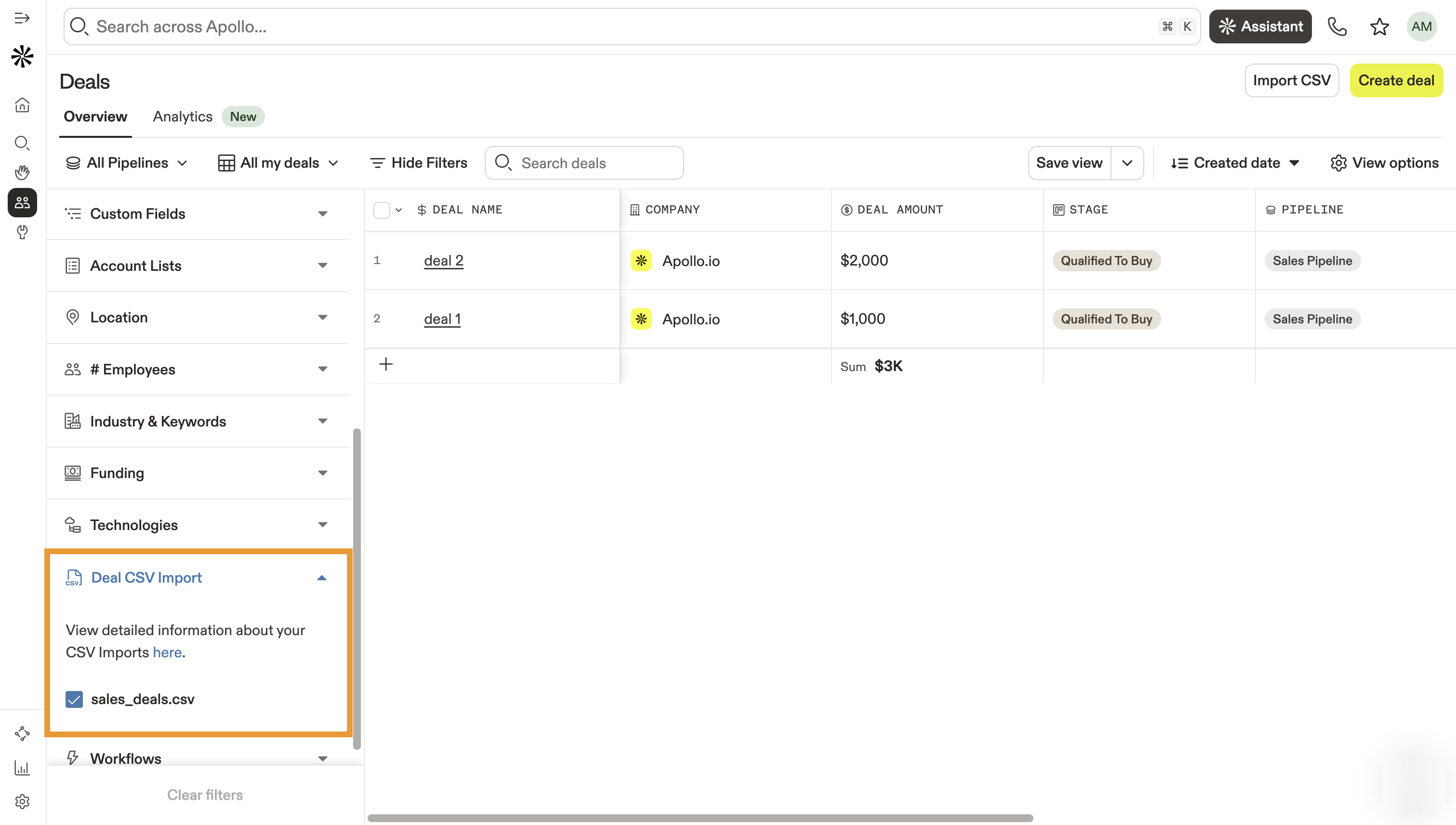 You can import a CSV file of deals from an external CRM to manage them in Apollo. This allows your team to simplify and consolidate deal management in one place.