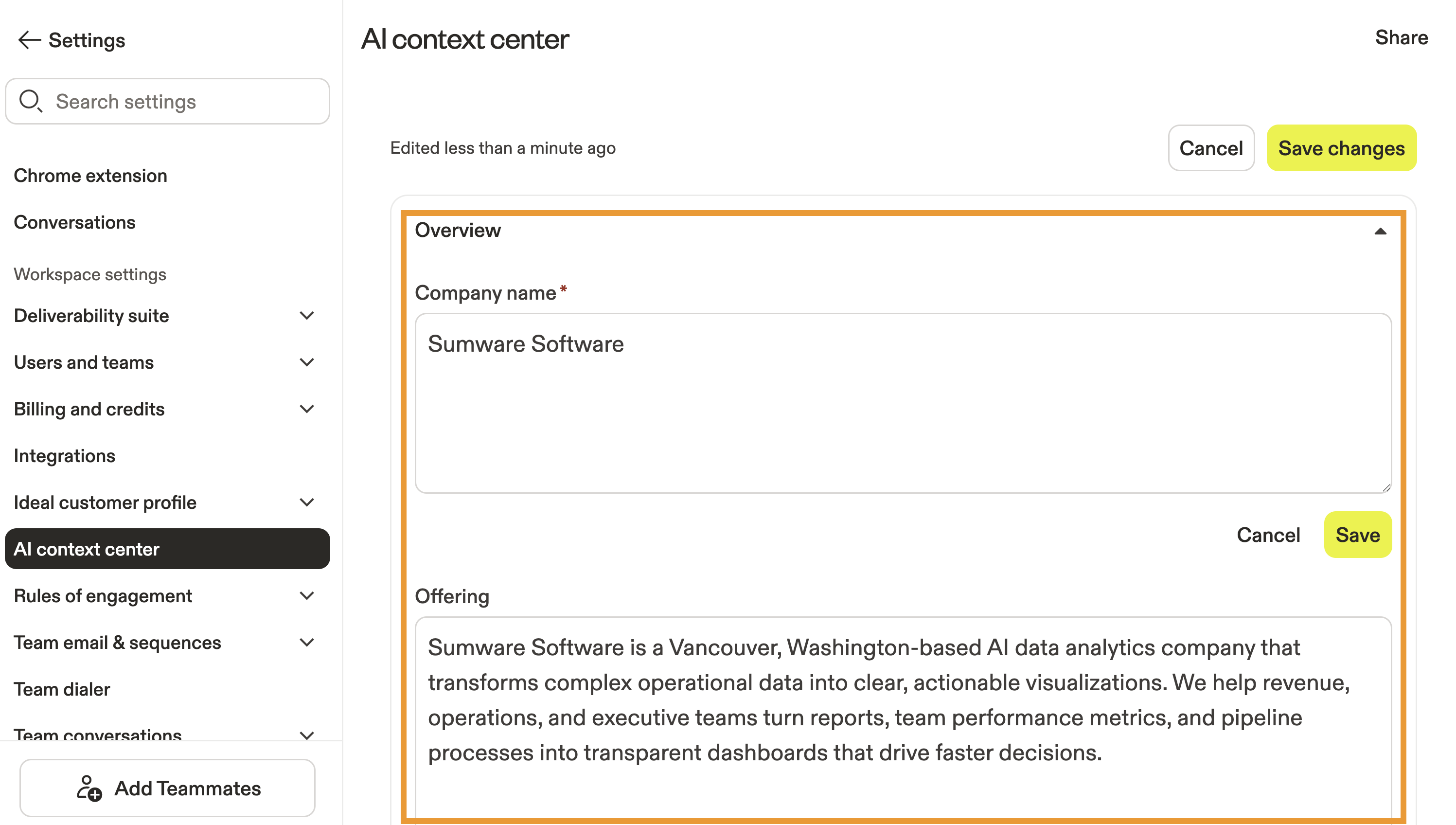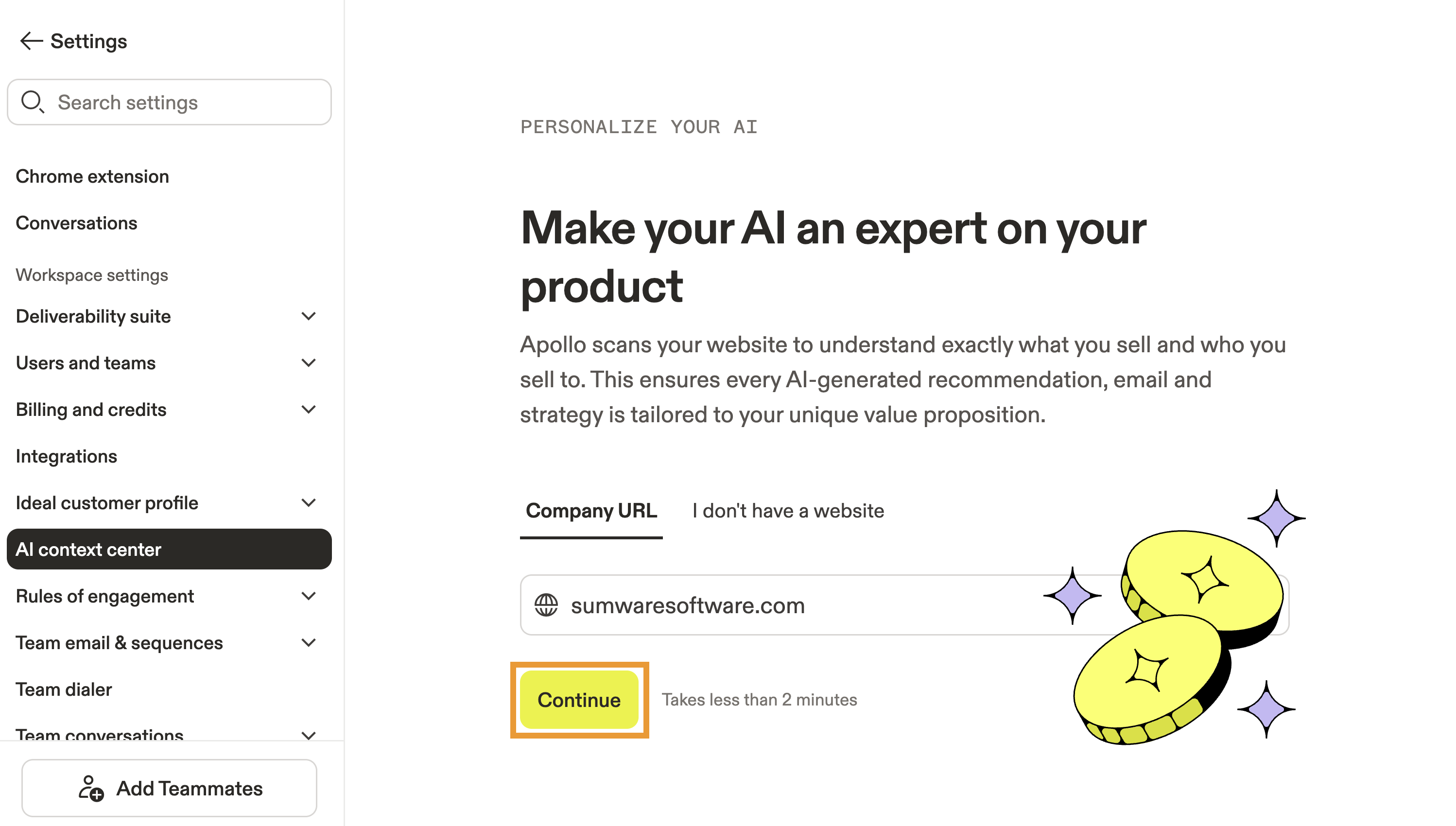 The AI context center sits at the heart of Apollo AI and lets you configure key factors about your company, customer pain points, and business or service. Apollo AI uses this information to ensure recommendations, messaging, research, and other actions performed by AI are tailored to your unique value proposition.