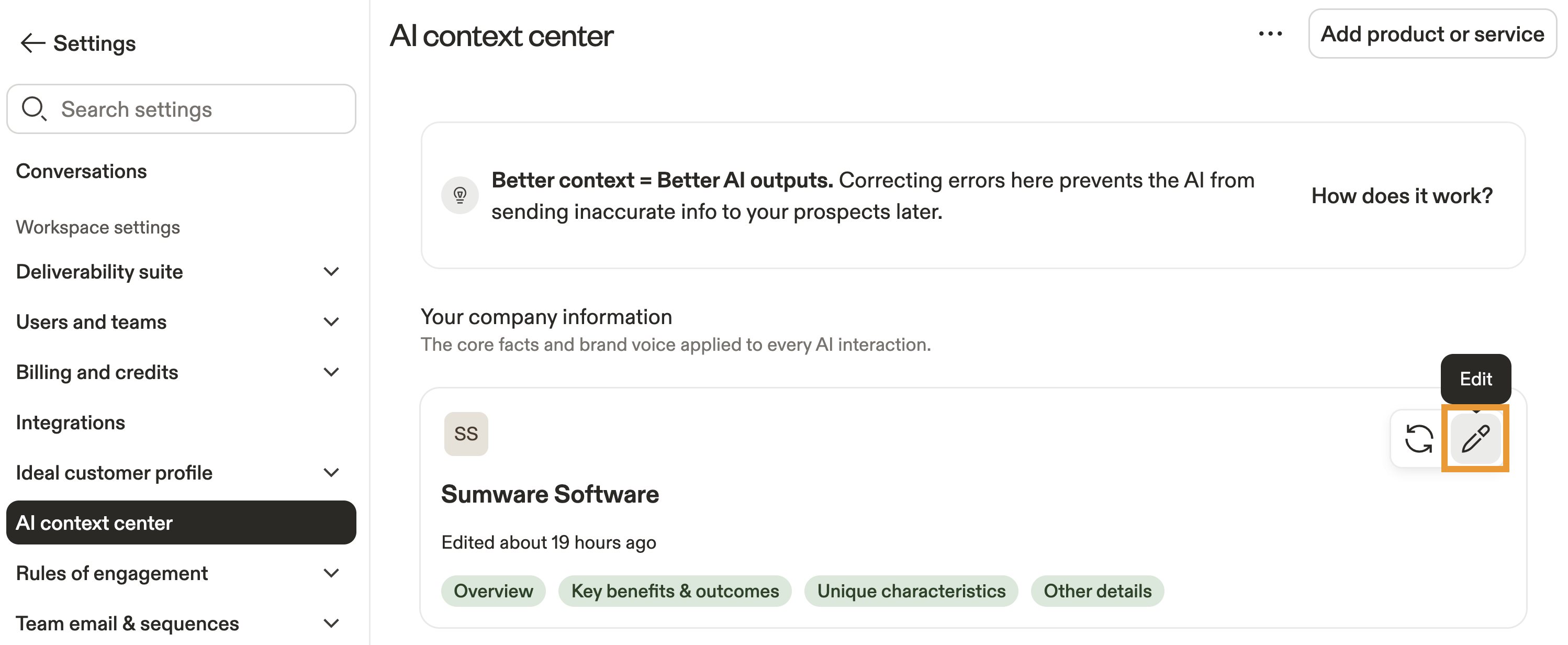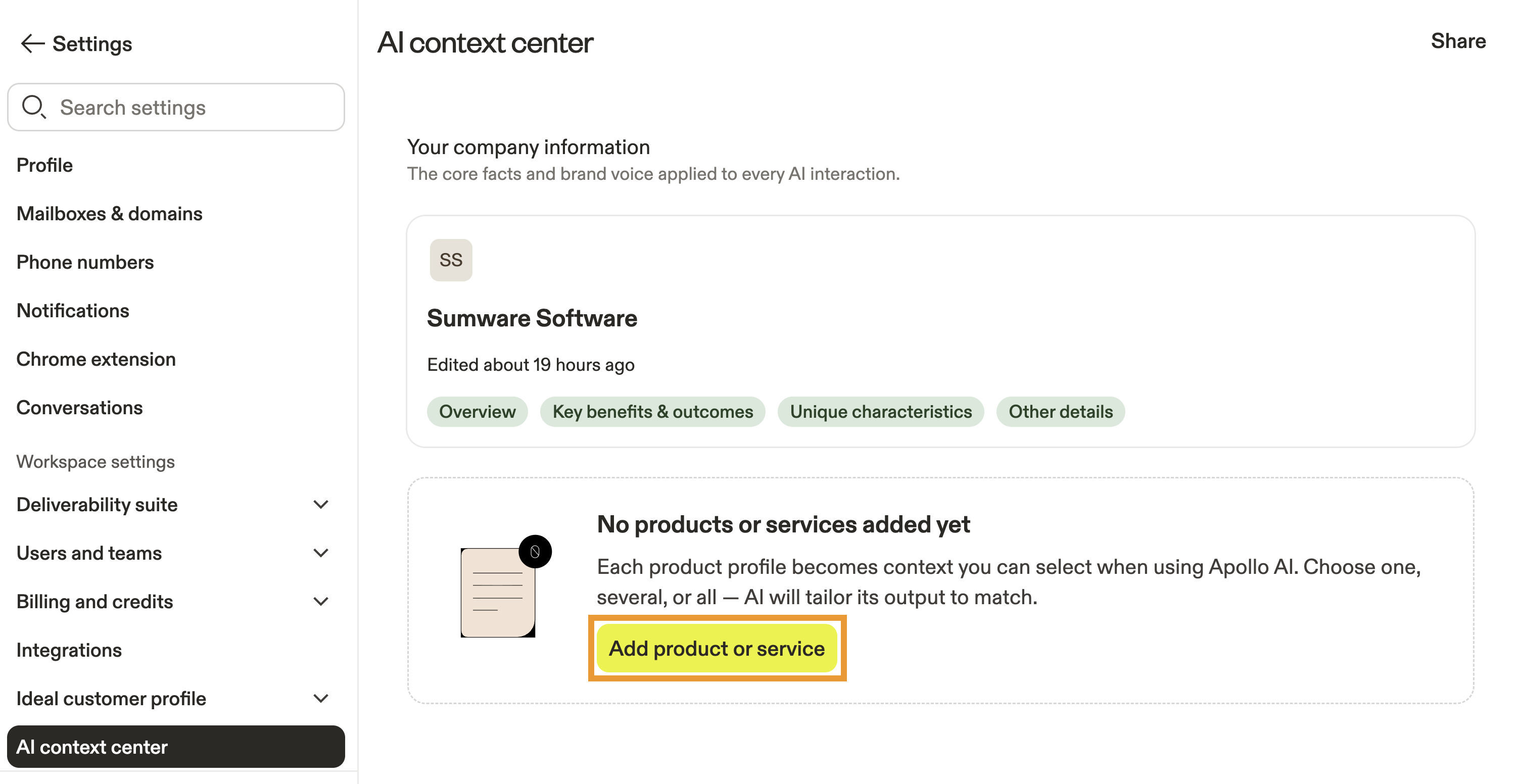 If you have multiple products or services, add them to the context center by clicking Add product or service at any time. When using Apollo AI, you can choose which product or service to use as context.