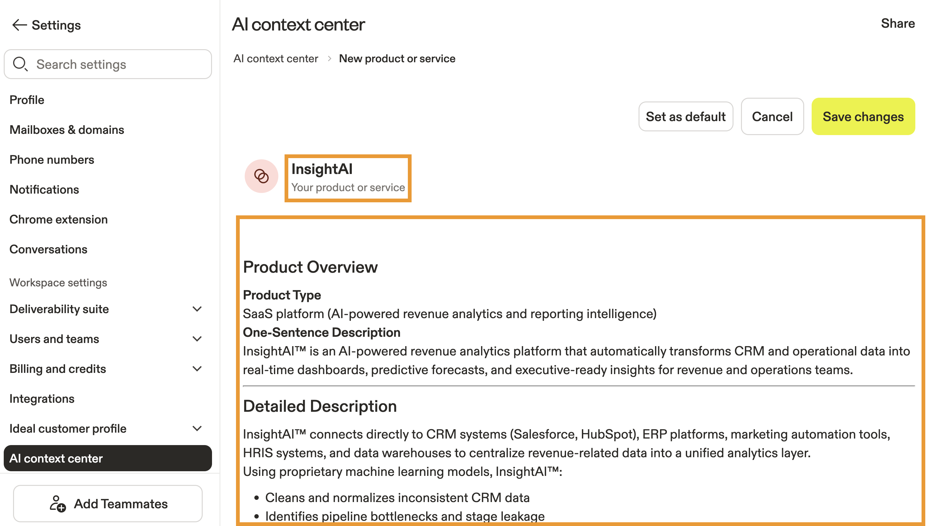 | Additional context | Any extra details that help AI understand your business — selling regions, company stage, bad-fit customers, or messaging guidelines. |