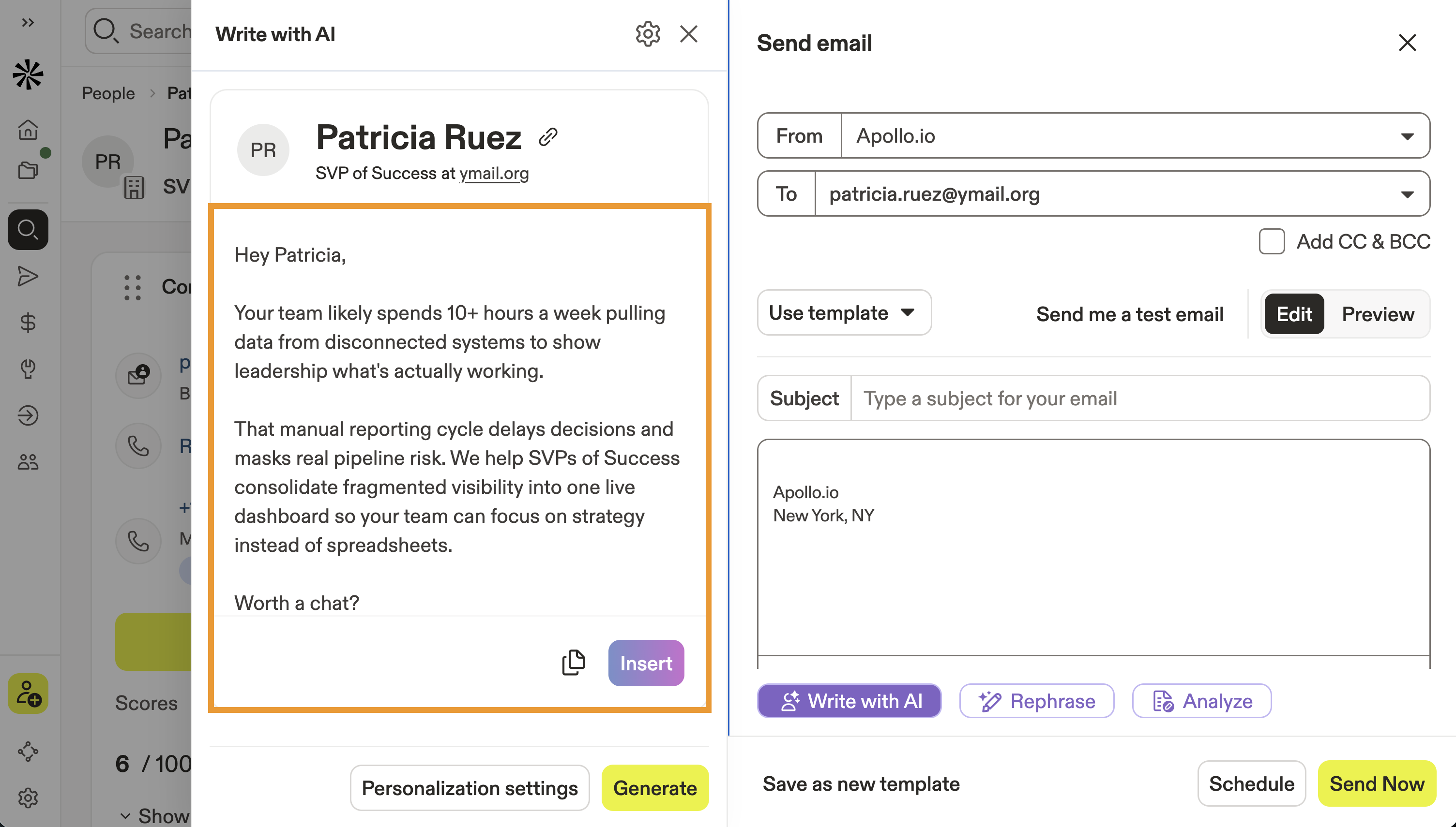 The assistant uses your Apollo data and context center information to generate recommendations and draft actions, then helps you apply them with preview and confirmation control. Get it done quicker from start to finish with the AI assistant.