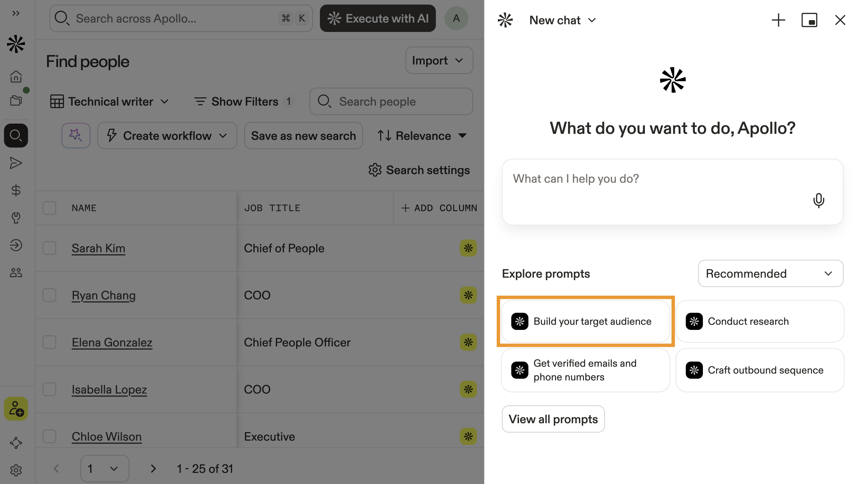 - Click to use a suggestion like Build your target audience or click View all prompts to see more prompts.