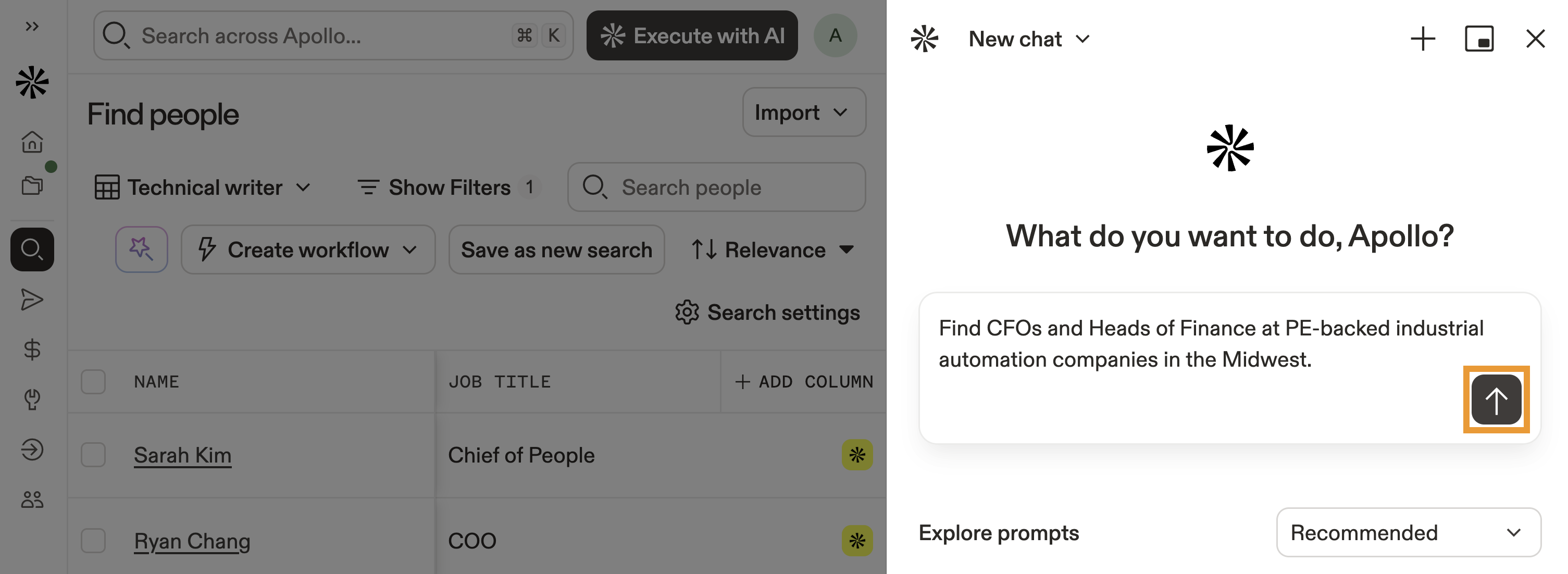 The AI assistant helps you find the right prospects faster. Use it to search for people and companies, generate ICP-matched results, score and qualify leads, summarize key facts, and save top matches to lists. With web-powered targeting, the assistant can pull deeper insights and help surface qualified prospects.