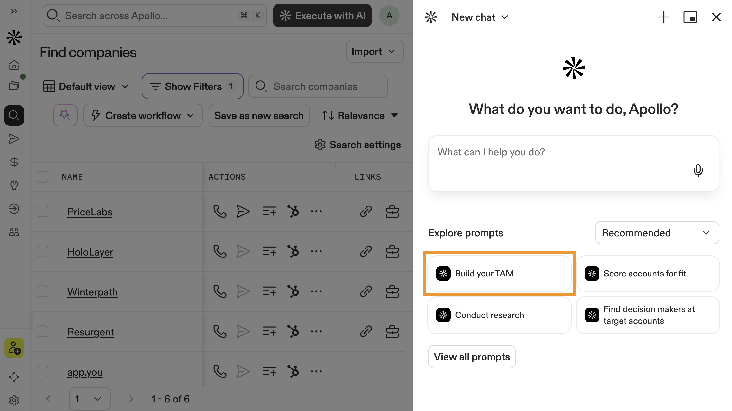 - Click to use a suggestion like Build your TAM or click View all prompts to see more prompts.