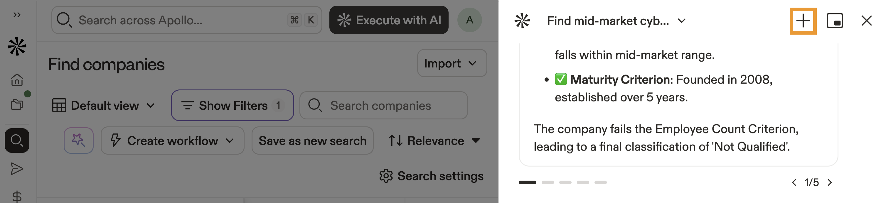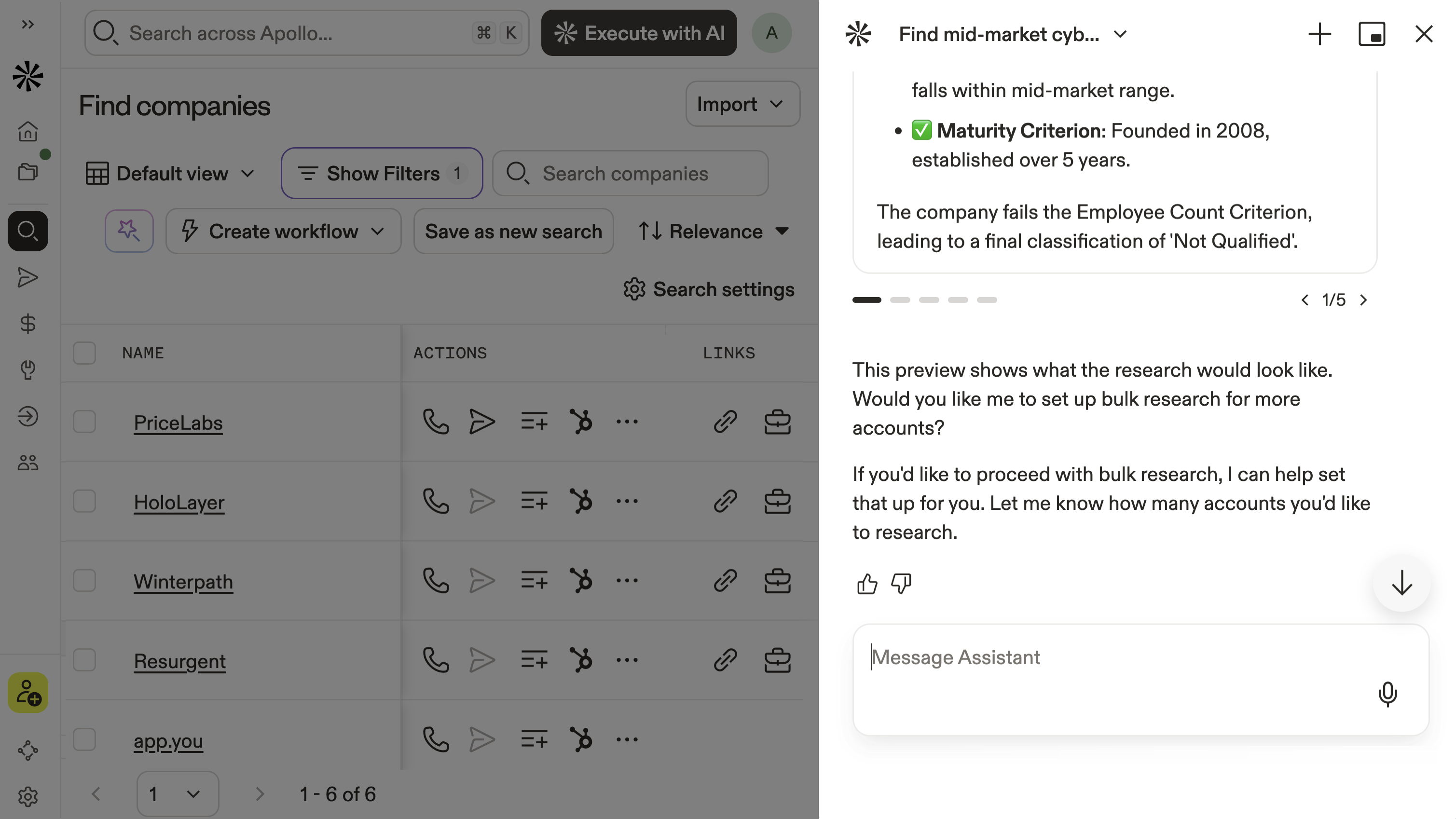 Now that you've narrowed to best-fit prospects, use the AI assistant to quickly research accounts and contacts before outreach. The assistant can generate company overviews, summarize key facts, and surface relevant insights using Apollo data and web-powered research.