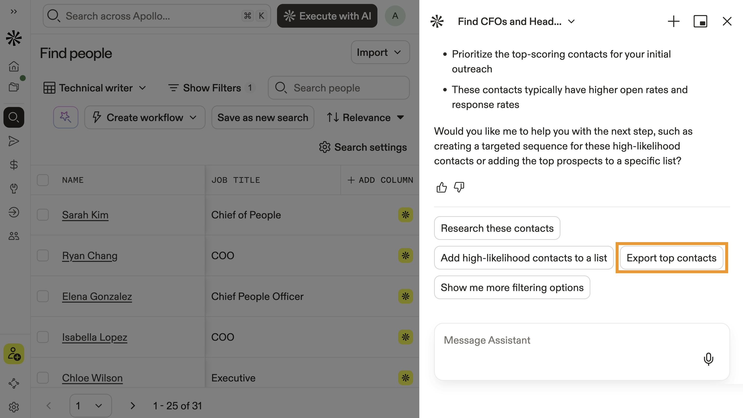 - The assistant executes the action after your confirmation. Review details before saving, exporting, or moving prospects into your next workflow.