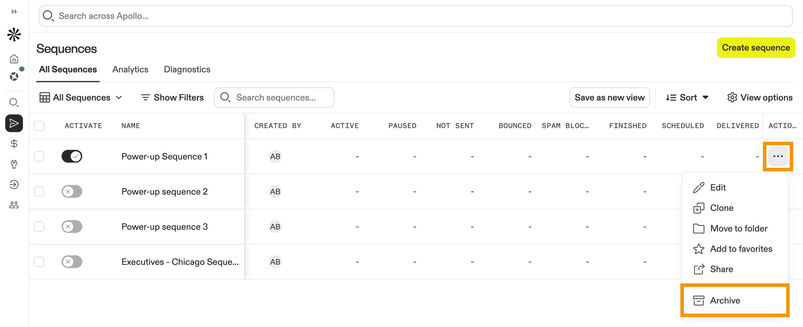 Sequences are outreach campaigns with sequential emails, touchpoints, and tasks that you can customize to engage your target contacts at scale. You can archive unused sequences in Apollo, so you can organize active sequences without deleting useful content that you may want to reference later.