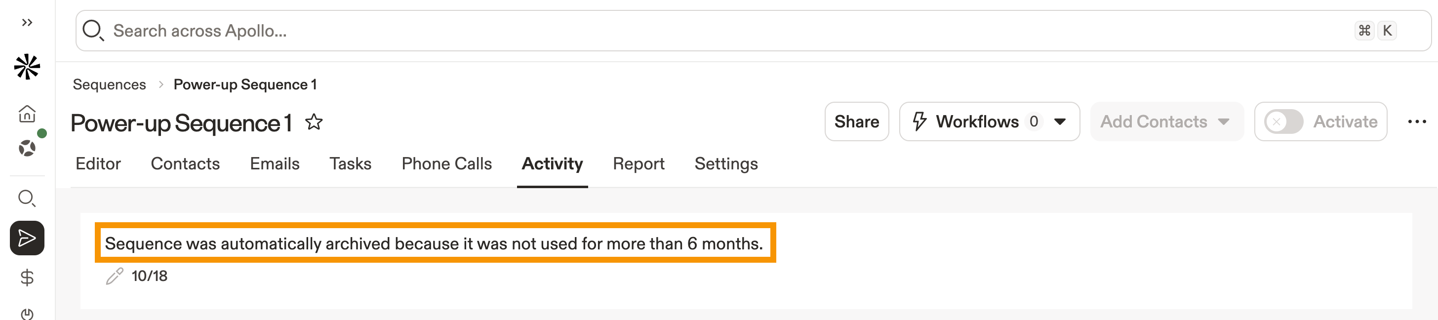 - The most recent activity log entry tells you whether the sequence was archived manually by a user or automatically by Apollo.