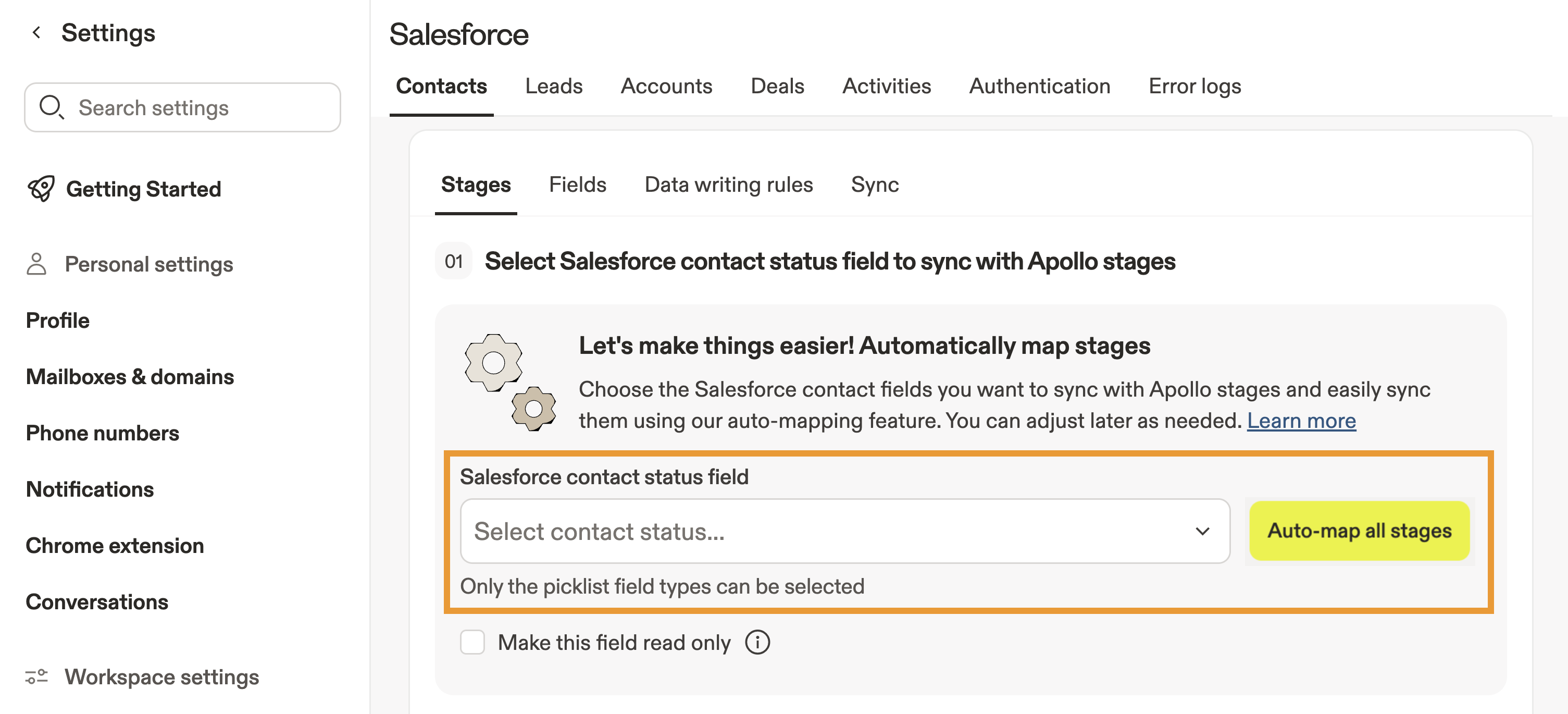 To automatically map your Apollo stages to your Salesforce fields: