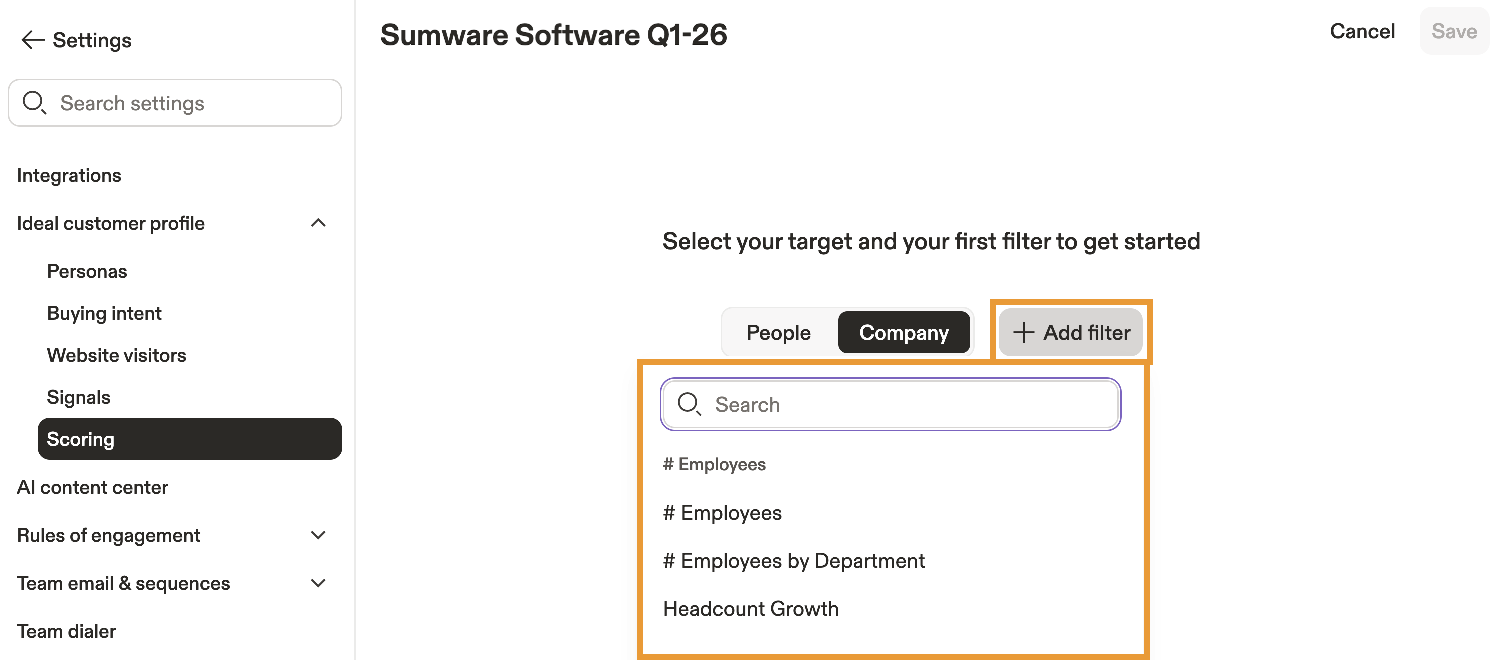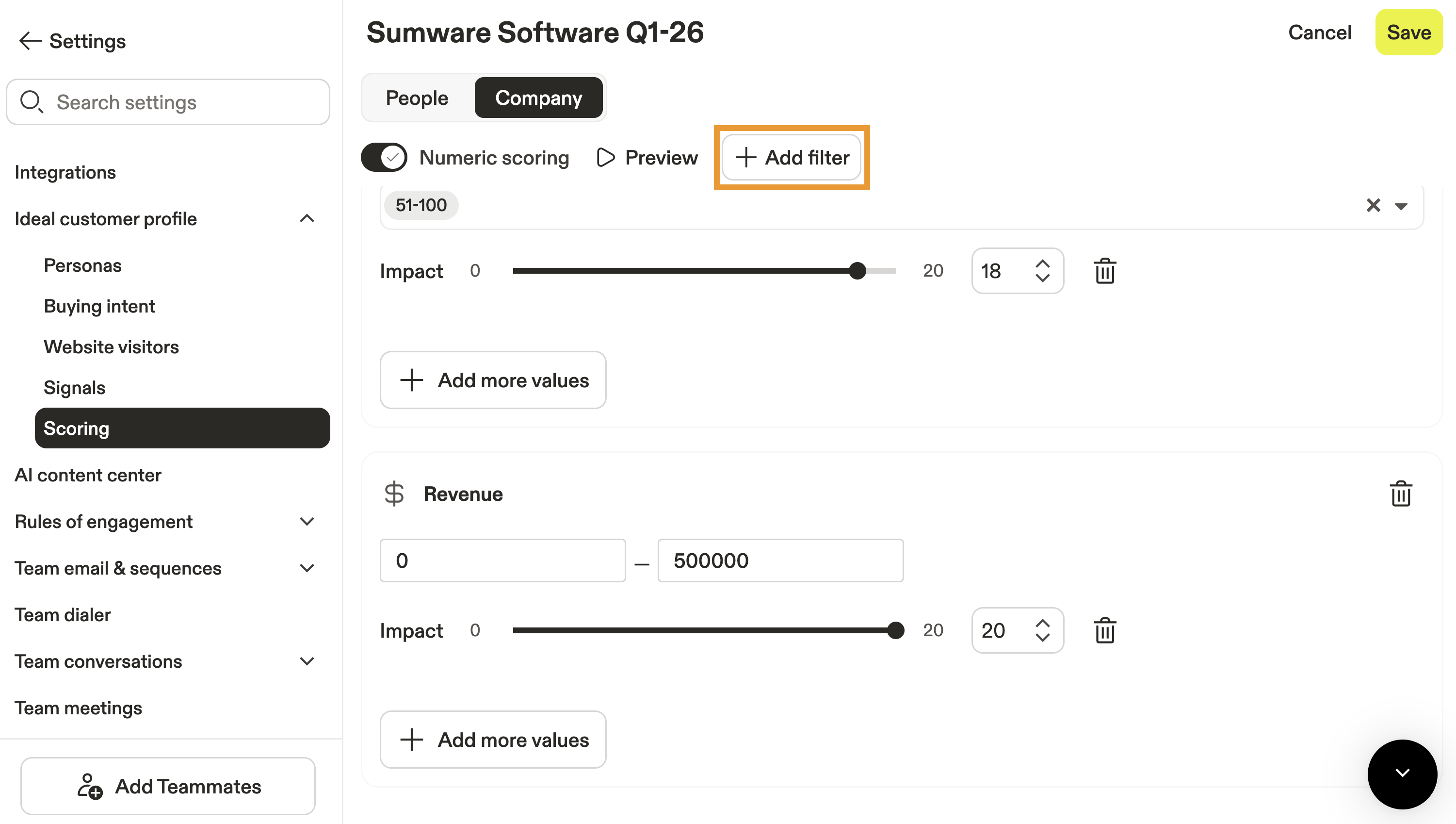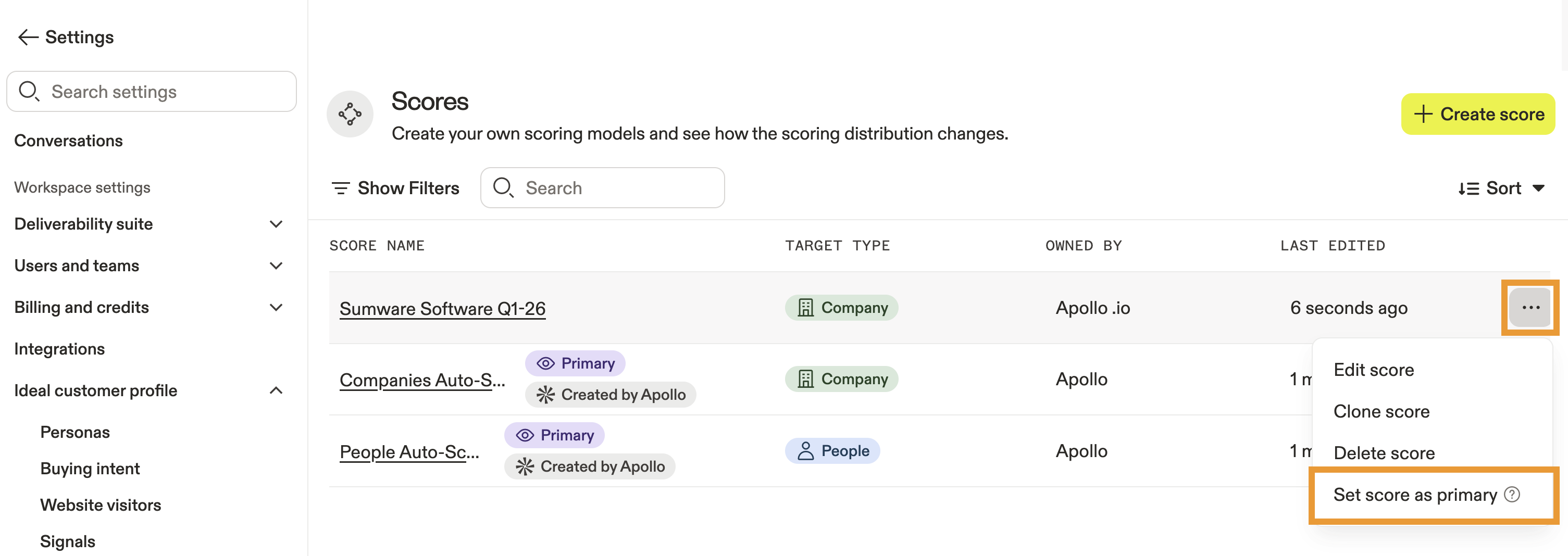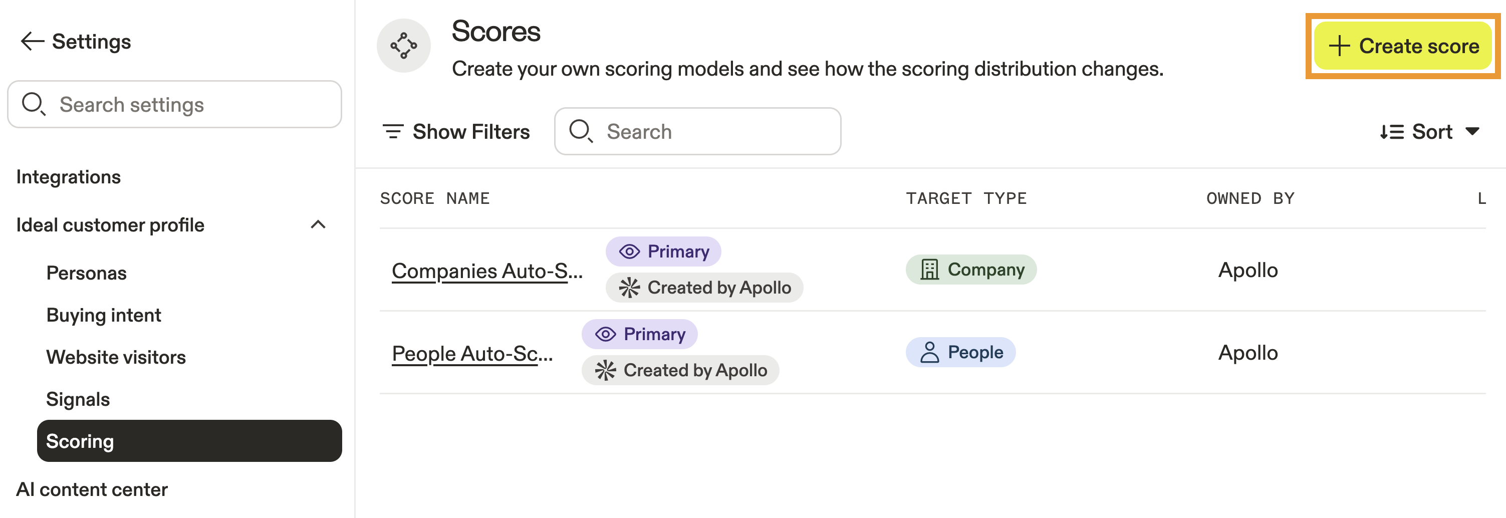 - Launch Apollo and click Settings > Ideal customer profile > Scoring.