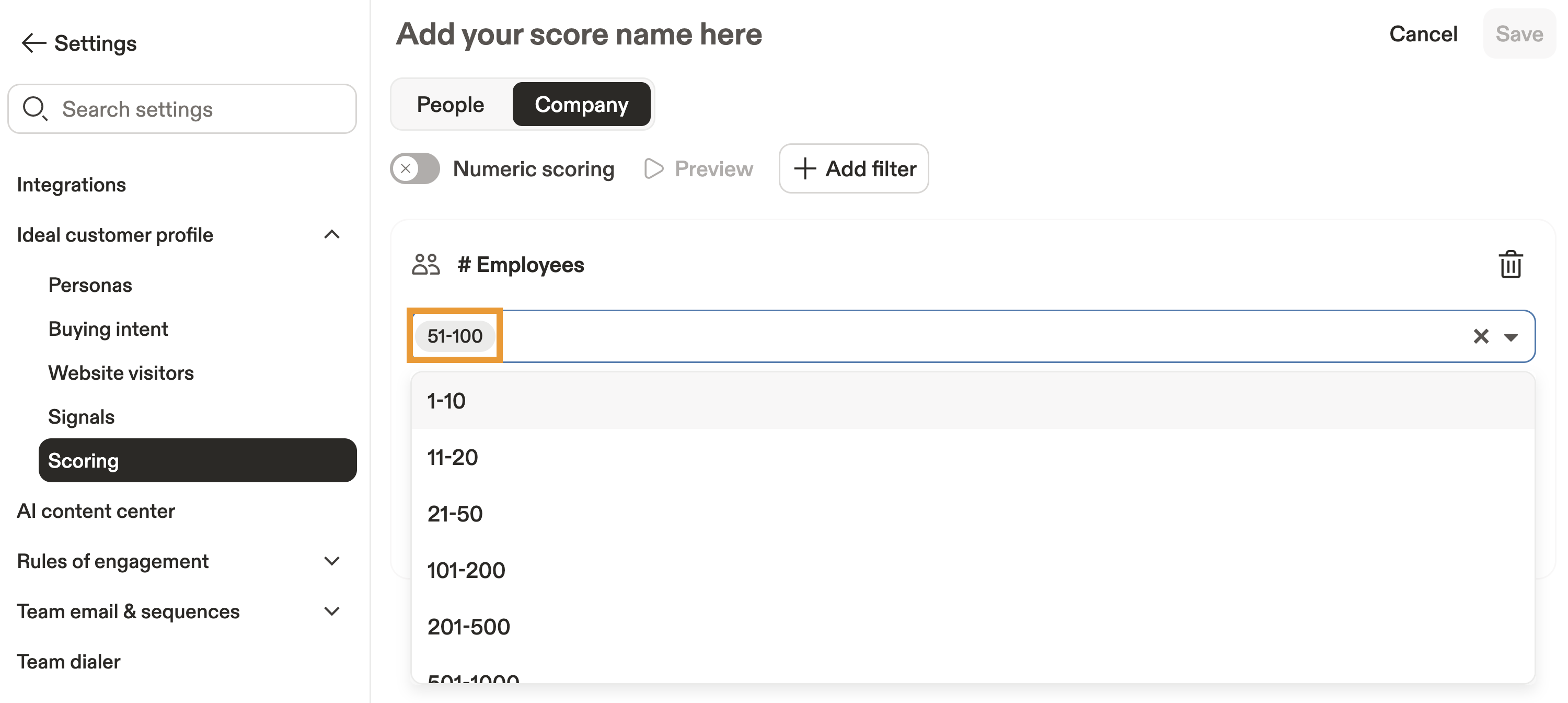 - Select to create a people or company score. Give your score a name.