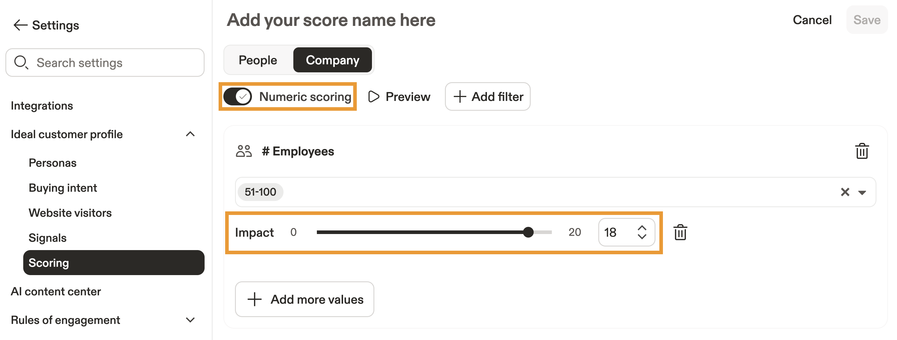 When you create a score, you must set one primary people score and one primary company score. These scores replace auto-scores as the default when your teams search for people or companies.