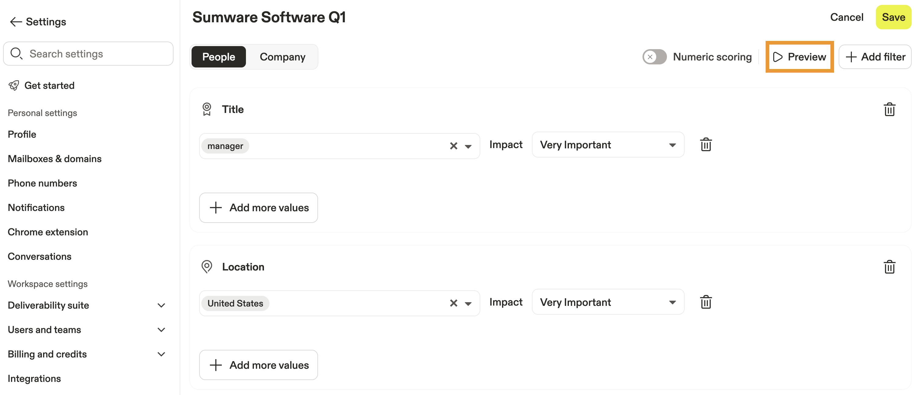- Select Saved people or All people, then click Re-render to visualize how prospects rank against your score.