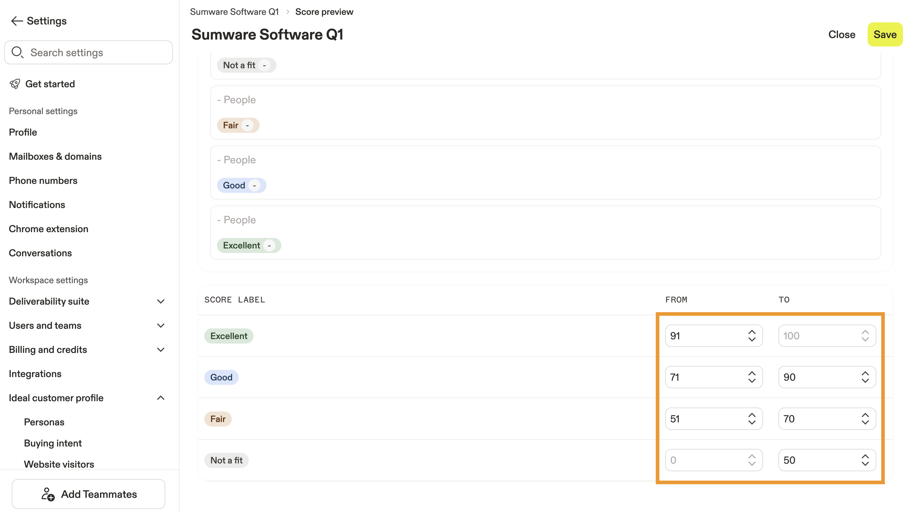 Is your ranking too restrictive? If you aren't seeing many excellent or good prospect scores, you may need to edit the score to be less restrictive. Click Close to edit the score further. Avoid being overly specific with too many filters that can bottleneck your score distribution.