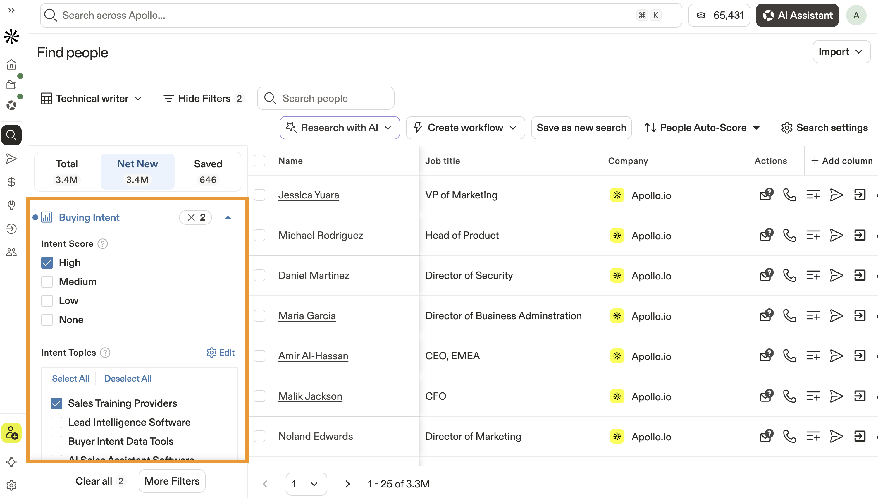 Access to buying intent topics and search filters depends on your Apollo plan. If you need access to buying intent, upgrade your plan. If you have questions about upgrading, reach out to the Apollo sales team.