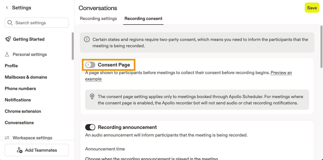 The consent page applies only to meetings booked through Apollo’s scheduler. For meetings where the consent page is enabled, Apollo’s recorder bot will not send audio or chat recording notifications. To direct users to the consent page: