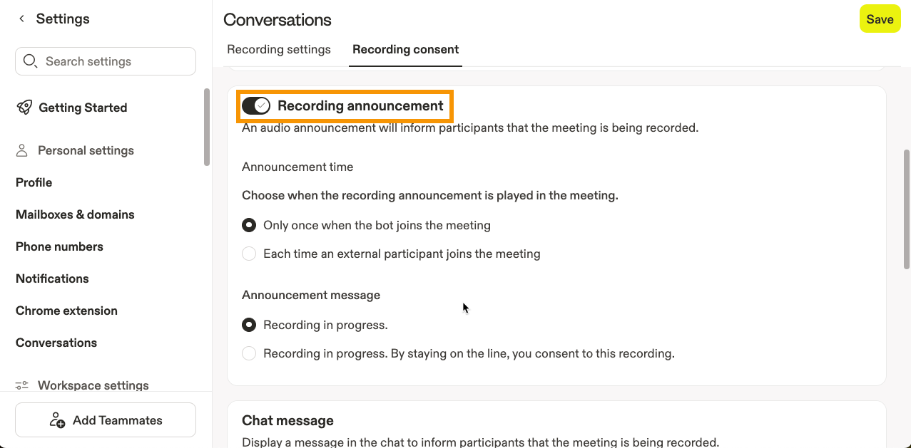 With conversations set up, you can add trackers, update your team's recording settings, and add a recording consent message: