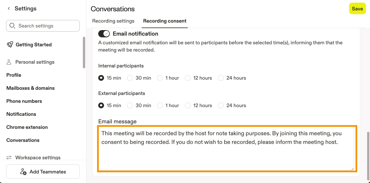 - Choose which types of conversations to record. To ensure your record as many eligible meetings as possible, click all the checkboxes for internal and external meetings. Then, click Save.